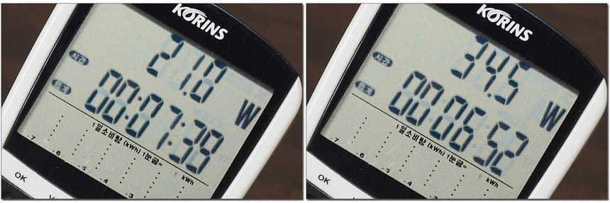 소비전력 테스트를 진행하고 있는 모습으로 100% 밝기에서는 34.5W 소비전력을 보여주었으며 50% 밝기에서는 21W로 소비전력이 낮아지는 것을 확인할 수 있었다. (해상도 대비 소비전력이 낮은 것이 무척 마음에 든다. 참고로 50% 밝기로만 설정해도 사용에 전혀 불편이 없는 모델이다.)