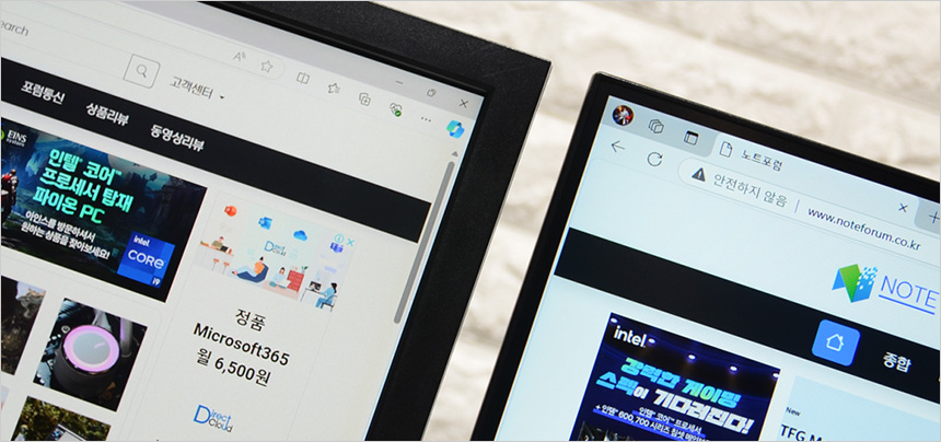 2대의 모니터를 셋팅한 김에 베젤 두께를 비교해 보았는데 사진과 같이 큰 차이가 발생하는 것을 확인할 수 있었다.