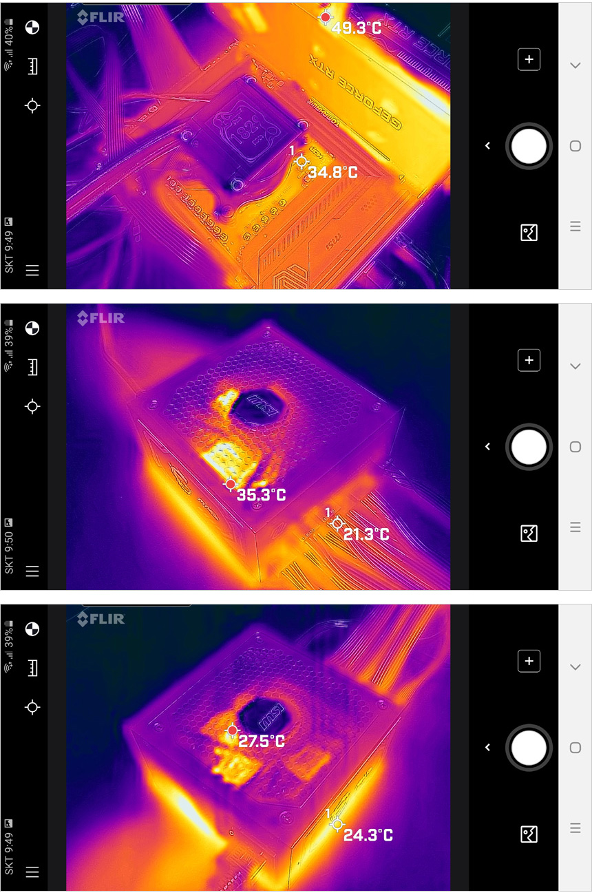 벤치 실행시 표면온도를 열화상 카메라로 확인한 모습으로 온도가 높은 그래픽카드 등과 달리 파워 서플라이 온도는 상당히 낮은 것을 확인할 수 있다. @ 참고로 실내 온도는 15도 였다.