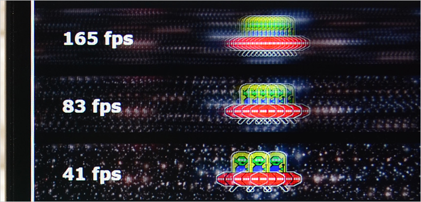 상단의 사진은 165Hz 의 높은 주사율을 쉽게 확인할 수 있도록 하위 프레임과 같이 재생되는 영상 (960 Pixel Per Sec) 을 셔터스피드 1/20 로 촬영한 모습으로 프레임이 높아질수록 시간당 많은 화면이 뿌려지기 때문에 캐릭터의 수가 많은 것을 확인할 수 있다. 직접 눈으로 영상을 볼 경우 165Hz 의 경우 무척 자연스럽게 UFO 가 이동한다. 보급형 게이밍 모니터와는 움직임에서 큰 차이를 경험할 수 있을 것이다.