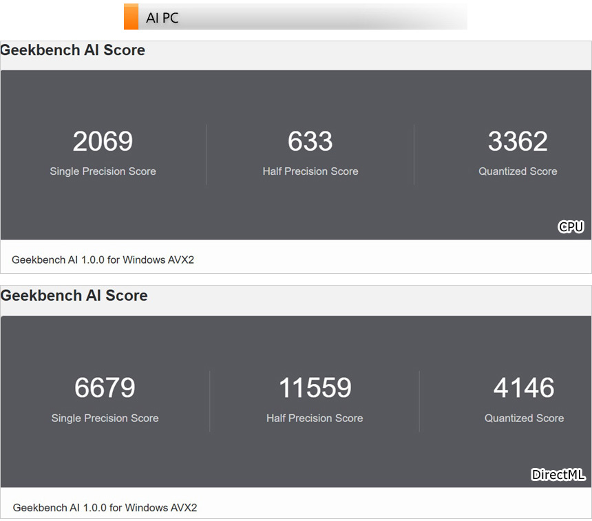 AI 전용 벤치마크 툴을 이용해 AI 성능 테스트를 진행하고 있는 모습으로 AI 에 특화된 CPU가 탑재된 모델답게 높은 스코어를 보여주었다.