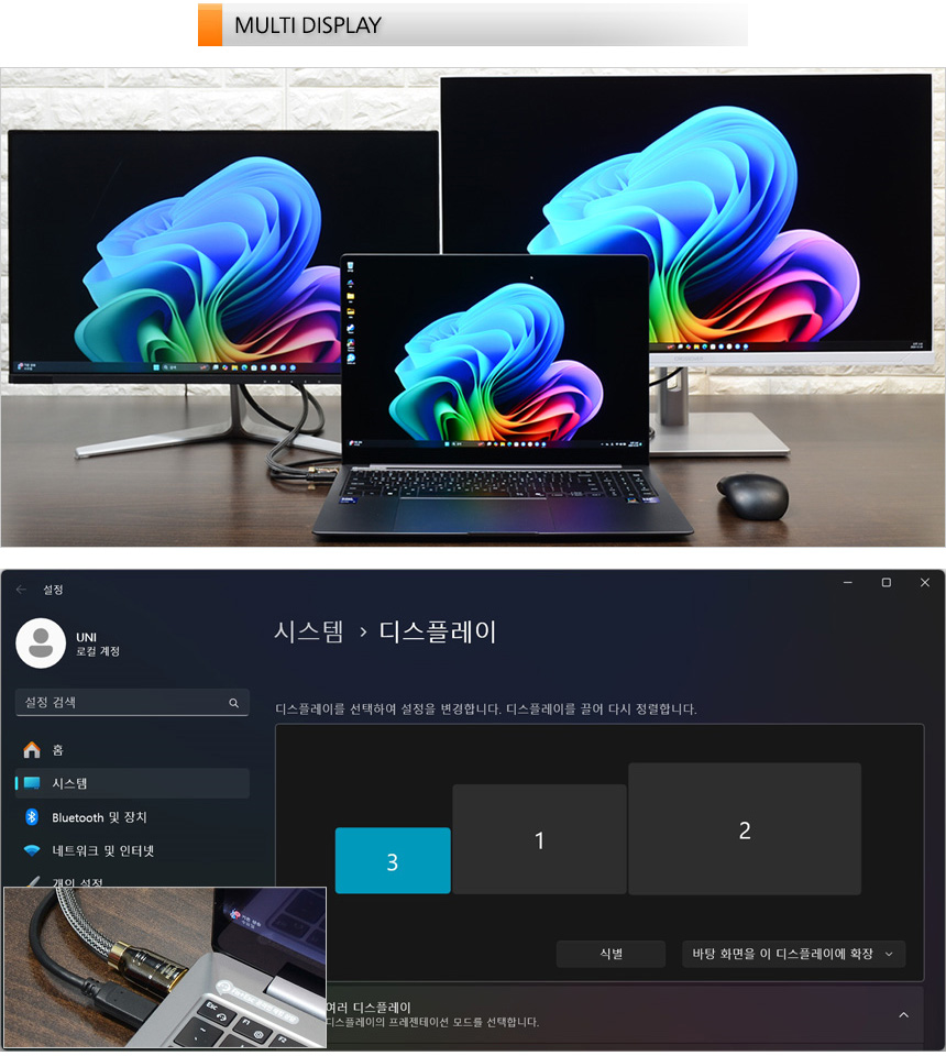 썬더볼트 4 단자가 디스플레이 출력을 지원해 HDMI를 포함한 2개의 모니터를 추가할 수 있다. 상단의 사진은 멀티 디스플레이 테스트를 진행하고 있는 모습으로 원활하게 작동하는 것을 확인할 수 있었다. @ 최대 모니터 개수가 4개였던 기존 프로세서와 달리 루나레이크는 3개의 최대 모니터를 지원한다. 이점 참조 바란다.