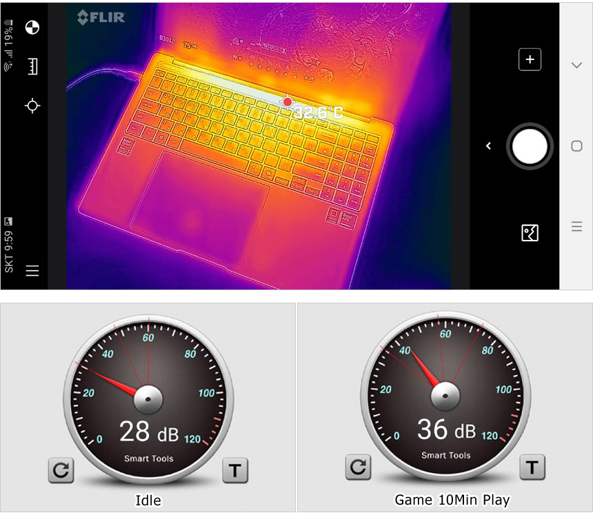 열화상 카메라를 이용해 게임 실행중 열분포를 확인하고 있는 모습으로 상단중앙을 중심으로 열이 퍼져나가며 팬이 설치된 양측면은 상대적으로 온도가 낮은 것을 확인할 수 있다. 또한 팜래스트 온도가 낮아 편하게 손을 올려두고 타이핑 할 수 있다. 하단의 사진은 팬소음 테스트를 진행하고 있는 모습으로 (최고 성능 모드) 캐주얼한 작업시에는 팬소음이 주변 생활소음에 묻혀 들리지 않았으며 게임이나 영상편집 S/W 등을 실행했을 때에는 36dB 까지 팬소음이 높아지는 것을 확인할 수 있었다.