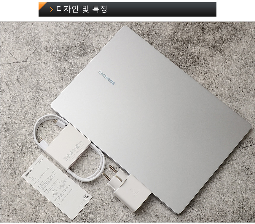 풀KIT 의 모습으로 노트북을 비롯해 65W 전원 어댑터와 C타입 USB 케이블이 제공되며 퀵 매뉴얼이 포함된 것을 확인할 수 있다.