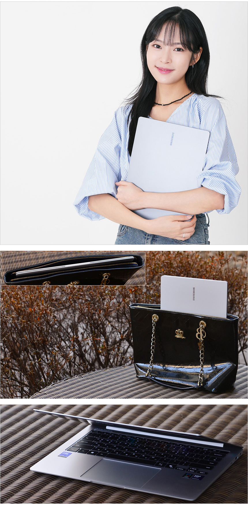 312.3 x 223.8 x 11.6mm 의 크기와 1.23Kg 의 무게를 지원한다. 1Kg 초반대의 가벼운 무게로 장시간 부담없이 들고 다닐 수 있으며 1cm를 살짝 넘는 날렵한 두께로 파우치 등을 사용하면 단독 휴대도 가능하다. 특히 배터리 사용시간도 대단히 길고 PD충전도 지원해 외부에서 전원 걱정없이 사용할 수 있다.