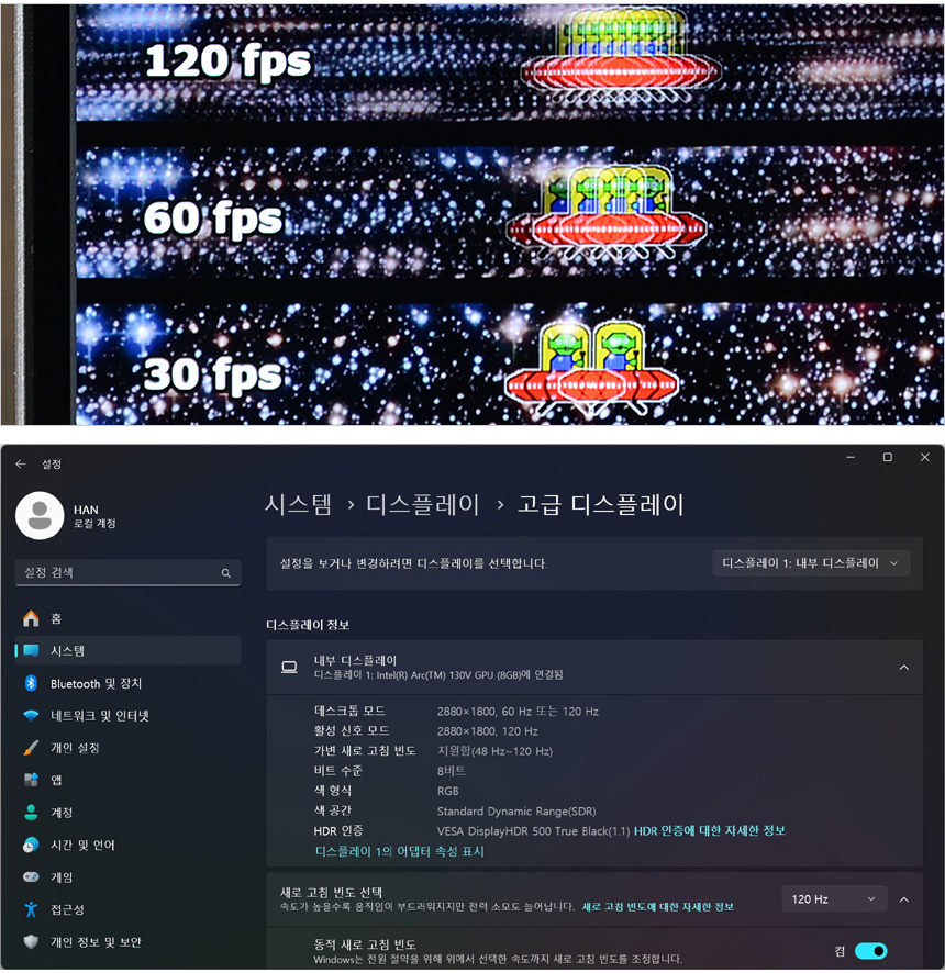 60Hz 주사율을 지원하는 일반 노트북과 달리 게이밍 노트북과 같이 120Hz 주사율 지원으로 부드러운 영상을 즐길 수 있으며 영상에 맞게 주사율을 조정하는 가변주사율을 적용해 불필요한 배터리 소모를 최소화 했다. 상단의 사진은 120Hz 주사율을 쉽게 인지할 수 있도록 하위 프레임과 같이 재생되는 영상 (960 Pixel Per Sec) 을 셔터스피드 1/20 로 촬영한 모습으로 프레임이 낮을수록 캐릭터의 수가 적으며 프레임이 높아질수록 시간당 많은 화면이 뿌려지기 때문에 캐릭터의 수가 많은 것을 확인할 수 있다.