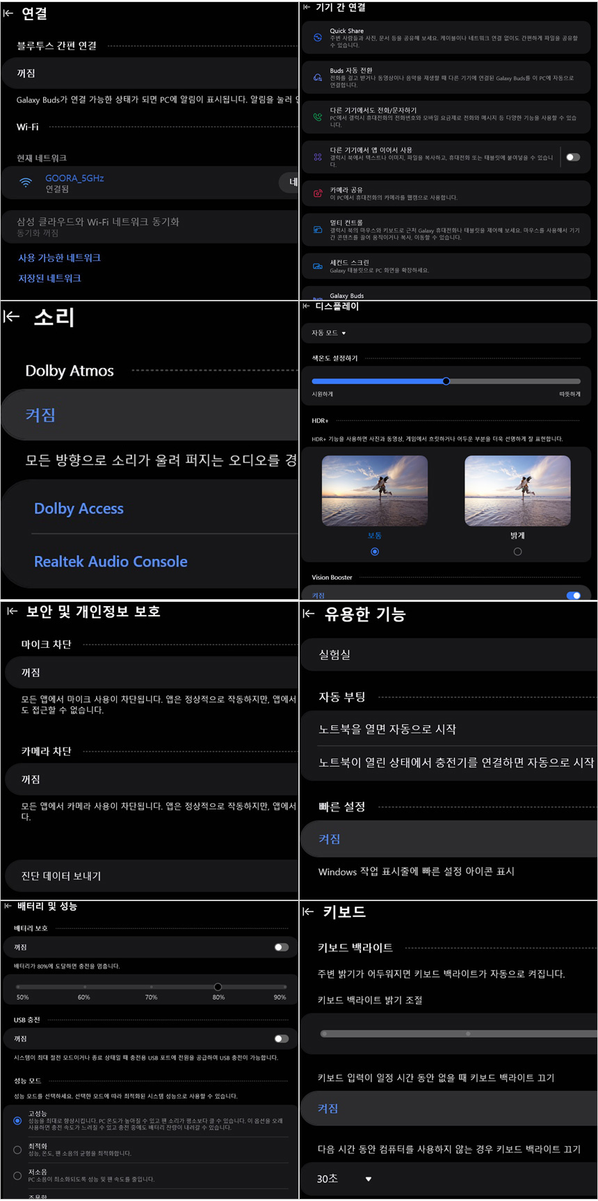 삼성 Settings의 모습으로 연결과 사운드 & 디스플레이 설정이 가능하며 퍼포먼스 설정과 자동부팅, USB 충전, 키보드 백라이트 설정 등을 지원한다. 또한 보안관련 설정을 지원해 보안성을 높일 수 있다.