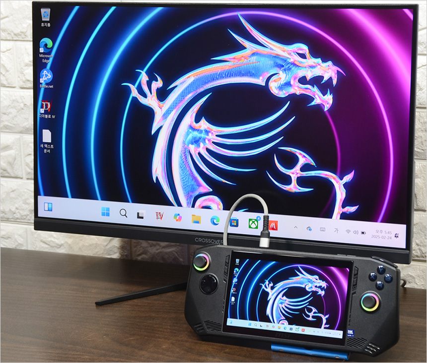 또한 PS5 나 XBOX 와 같은 게임콘솔과 연결해 게임을 즐길 수 있으며 (HDCP 1.4지원) 최근 많은 유저들이 사용하고 있는 게이밍 UMPC와 연결해 대화면으로 게임을 플레이 할 수 있다. (C타입 to HDMI 케이블로 연결했다.)