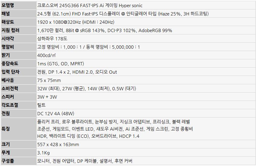 @ 크로스오버 에서는 320Hz 주사율을 지원하는 245G366 FAST-IPS Ai 게이밍 Hyper sonic 뿐만 아니라 400Hz 주사율을 지원하는 245G466 FAST-IPS Ai 게이밍 Hyper sonic 모델도 출시를 앞두고 있다. 이점 참조하기 바란다.