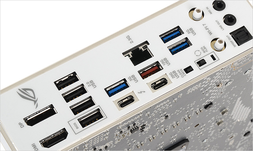 뿐만 아니라 썬더볼트 단자를 지원해 초고속 데이터 전송이 가능하며 USB 3.2 Gen2x2 와 Gen2, Gen1 등 다양한 USB 슬롯을 제공해 편하게 주변기기를 연결할 수 있다. S/PDIF를 포함한 오디오 단자가 설치되어 있고 2.5G 이더넷 단자와 Wi-Fi 7 무선랜 사용을 위한 2개의 안테나 단자가 설치되어 있는것도 눈에 띈다. (안테나 단자는 볼트를 돌려주어야 했던 예전과 달리 밀어주면 자동 장착되도록 설계해 편의성을 높였다.)