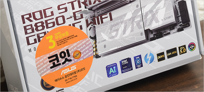 리뷰를 진행하는 ASUS ROG STRIX B860-G GAMING WIFI 는 인텔 데스크탑과 서버 CPU 등의 국내 공급을 주도하고 ASUS, ECS, 삼성 등의 제품을 유통하는 에이수스 공인 대리점 코잇에서 유통 및 A/S를 진행하고 있다. 3년 무상보증을 지원하며 메인보드 사용중 문제가 발생했을 때 코잇으로 연락하면 빠르게 조치를 받을 수 있다.