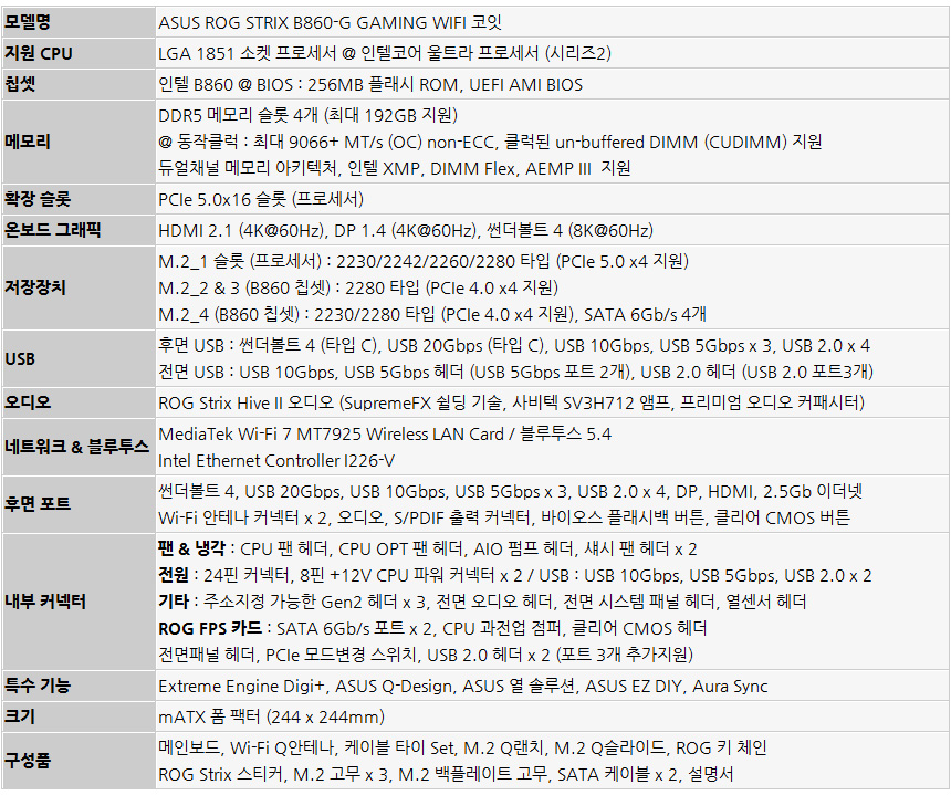 이번에 리뷰를 진행할 ASUS ROG STRIX B860-G GAMING WIFI 코잇은 인텔코어 울트라 245K 나 논K 프로세서를 이용해 고성능 게이밍 PC나 작업용 PC를 만들고 싶은 유저들을 위한 고급형 B860 칩셋 m-ATX 메인보드로 메인스트림급 라인업인 TUF 시리즈와는 확연히 다른 스펙을 보여준다.