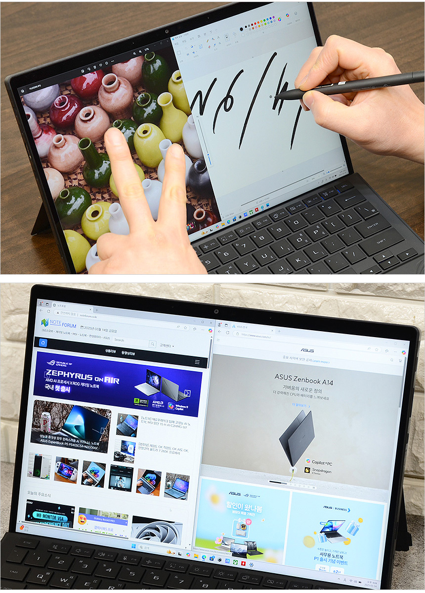 눈길을 사로잡는 고급스러운 디자인도 매력적이며 AI 성능이 상당히 뛰어나 생성형 AI 애플리케이션을 부드럽게 실행할 수 있는점도 장점이라 할 수 있다. 또한 탈부착이 가능하고 뛰어난 키감을 제공하는 키보드와 부드럽고 정확한 드로잉이 가능한 터치팬 지원으로 인상적이었다.