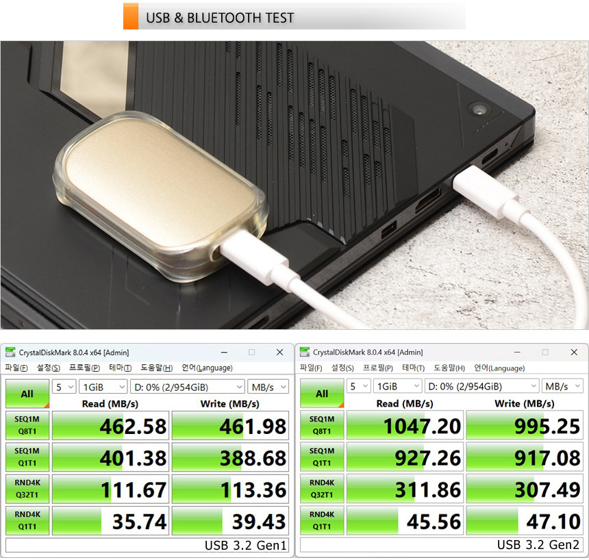 USB 4 단자를 지원해 빠른 데이터 전송이 가능하다. 상단의 사진은 USB 3.2 Gen2 지원 외장 SSD를 이용해 테스트를 진행하고 있는 모습으로 USB 3.2 Gen1 과 확연하게 비교되는 빠른 속도를 보여 주었다.