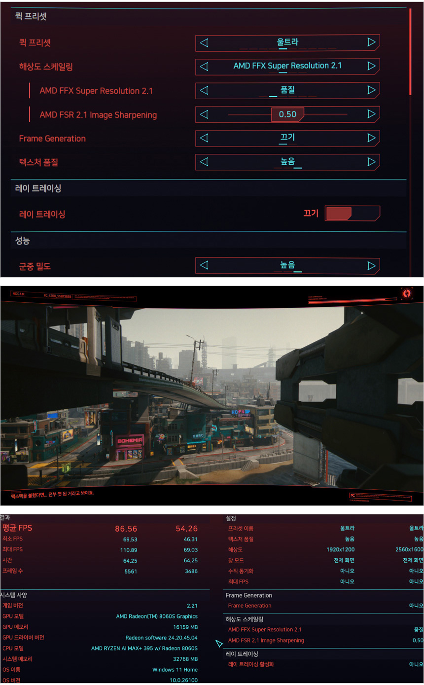 시스템 정보를 확인하고 있는 모습으로 16코어 32스레드에 16MB+64MB 캐시를 제공해 괴물같은 성능을 보여주는 AMD 라이젠 AI MAX+ 395 프로세서가 장착된 것을 확인할 수 있다. 특히 라데온 8060S 그래픽은 기존의 내장그래픽과 완전히 다른 성능을 보여주어 최신 게임을 상위 옵션에서 부드럽게 즐길 수 있다.