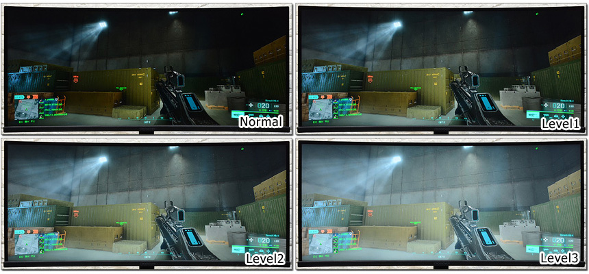 암부의 명암비를 높여 어두운 곳에 숨어있는 적을 쉽게 발견할 수 있도록 하는 블랙레벨을 지원한다. 상단의 사진은 비교 테스트를 진행하고 있는 모습으로 값이 높아질수록 시인성이 개선되는 것을 확인할 수 있었다.