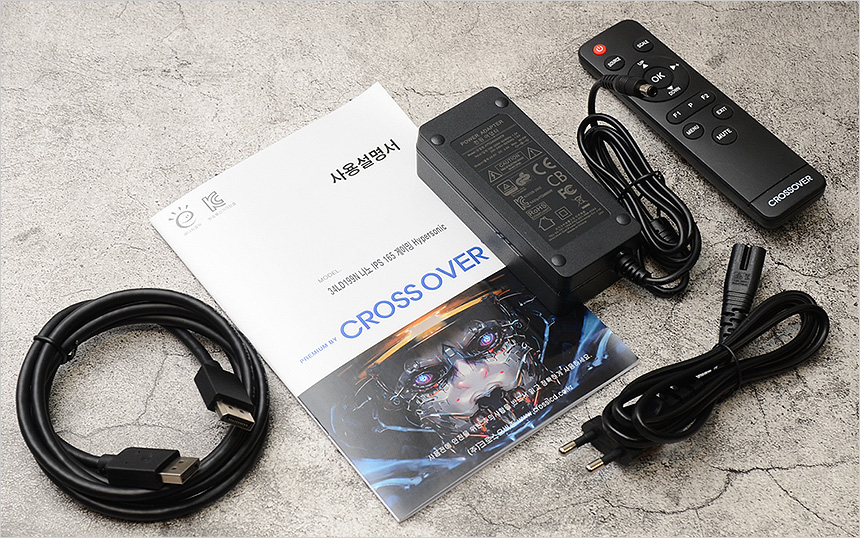 기본 제공되는 액세서리의 모습으로 사용 설명서를 비롯해 전원 어댑터와 전원 케이블, DP 케이블이 제공되며 무선 리모콘이 포함된 것을 확인할 수 있다.