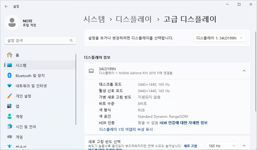 책상위에 PC와 모니터를 설치한 모습으로 대화면 울트라와이드 모니터 답게 많은 공간을 차지했다. 이 제품은 일반 모니터 대비 좌우폭이 무척 넓기 때문에 모니터 설치전 반드시 여유 공간을 확보해야 한다. 2개의 DP 와 HDM 단자를 지원해 PC뿐만 아니라 게임콘솔이나 OTT 플레이어등 다양한 디바이스 연결이 가능하며 HDR 기술이 적용된 모델답게 디스플레이 메뉴에서 HDR 설정이 가능한 것을 확인할 수 있다.