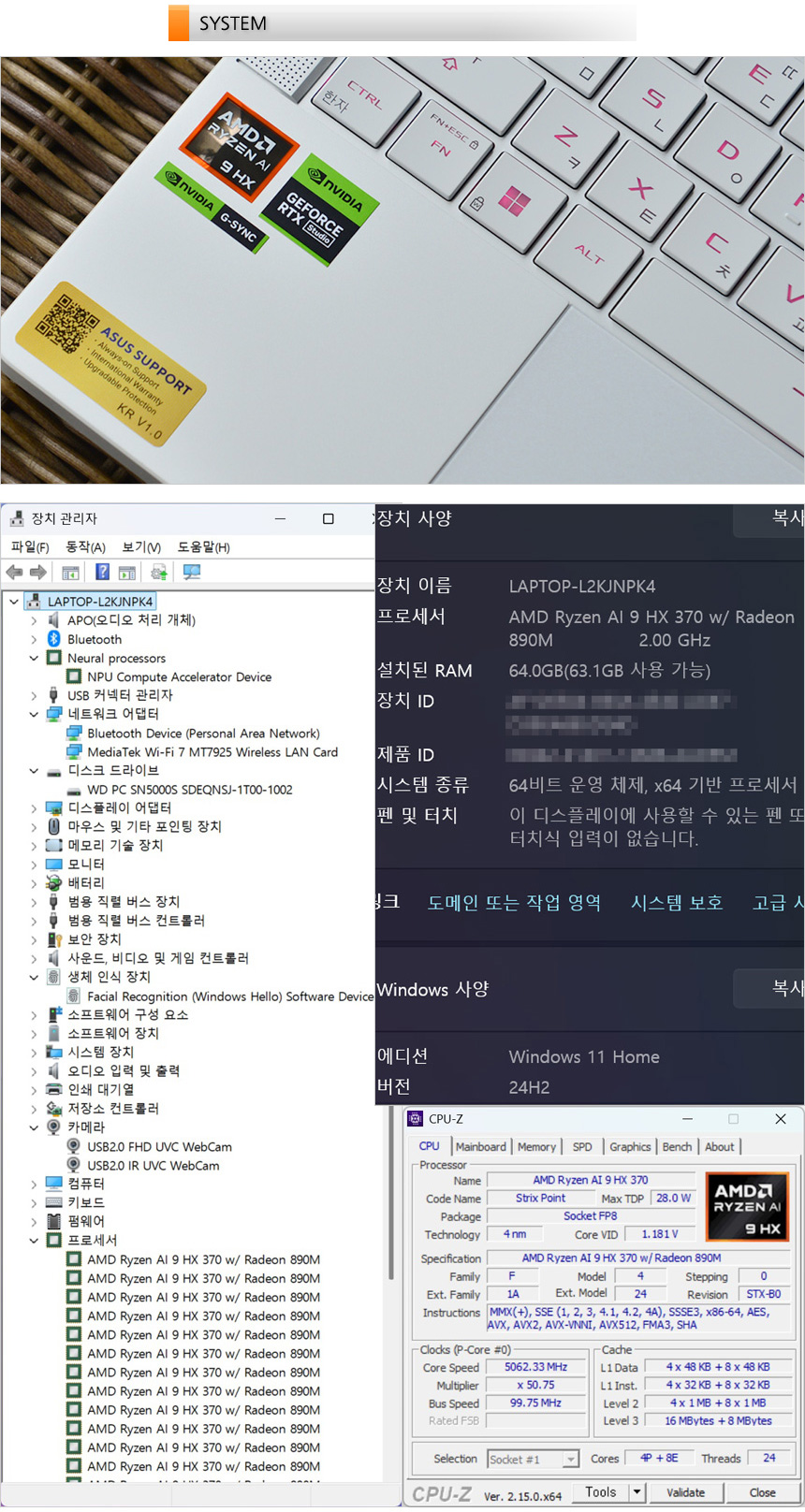 시스템 정보를 확인하고 있는 모습으로 12코어 24스레드에 12MB + 24MB 캐시가 장착된 최상급 모바일 프로세서 라이젠 AI 9 HX 370이 장착된 것을 확인할 수 있으며 34GB LPDDR5X 메모리와 1TB PCIe 4.0 NVMe SSD을 지원한다. 또한 라데온 890M 내장그래픽과 RTX 5070 Ti? 외장 그래픽이 적용되어 있고 Wi-Fi 7 무선랜카드가 설치되어 고속 무선랜과 블루투스 사용도 가능하며 IR 카메라를 지원해 얼굴인식 로그인 사용이 가능하다.