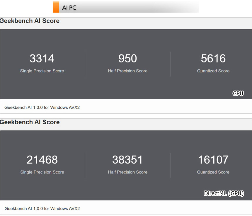 AI 전용 벤치마크 툴을 이용해 AI 성능 테스트를 진행하고 있는 모습으로 NPU가 탑재된 최상급 프로세서와 고성능 GPU가 탑재된 모델답게 일반 노트북을 압도하는 높은 스코어를 보여주었다.