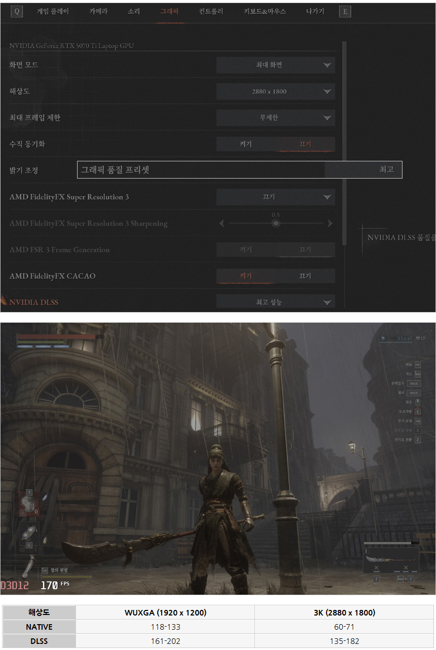 몬스터 헌터 와일드 벤치마크를 울트라 옵션으로 실행한 모습으로 (VRAM 이 8GB 이하의 제품은 울트라 옵션을 설정하기 힘들다.) 해상도에 상관없이 쾌적하게 게임을 즐길 수 있다. (DLSS를 활성화 하고 게임을 즐기기 바란다.)