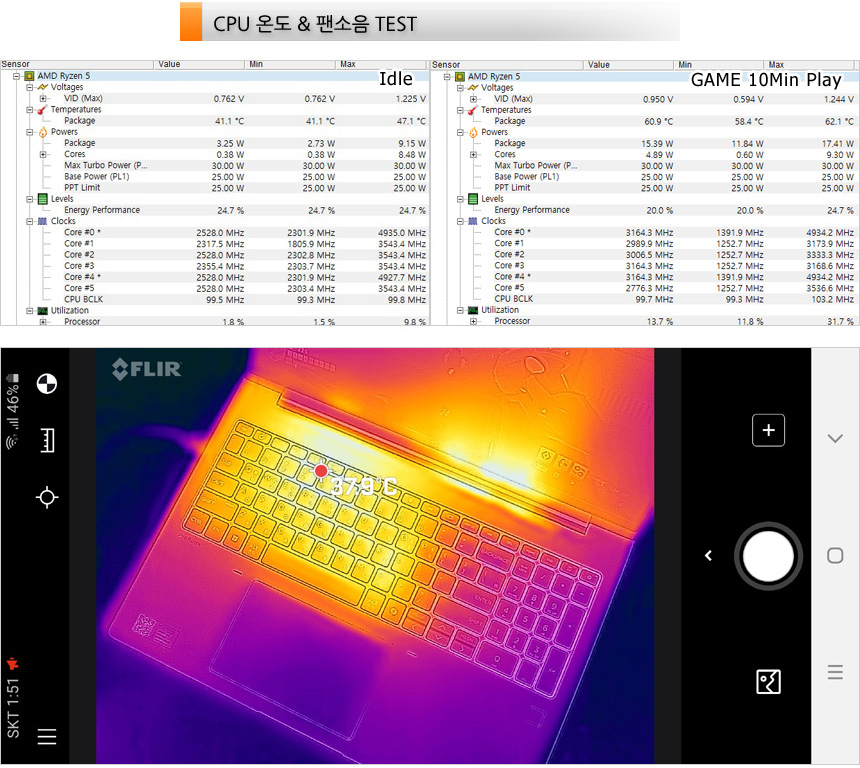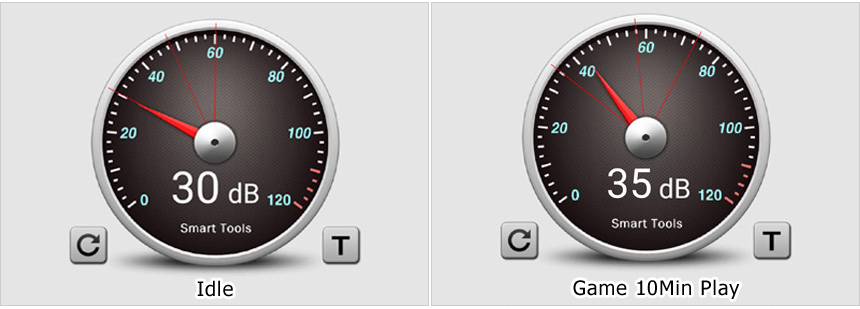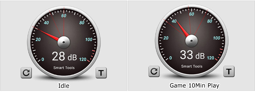 팬소음 테스트를 진행하고 있는 모습으로 캐주얼한 작업시에는 팬이 회전하긴 하지만 소음이 들리지 않았지만 게임을 실행하면 팬소음이 발생하는 것을 확인할 수 있었다. 단, 스피커 사운드에 뭍히는 수준으로 팬소음으로 인한 스트레스는 크지 않았다. (측정값은 순수한 팬소음이 아니고 팬소음을 포함한 사무실의 생활 소음이다. 이점 참조 바란다.)