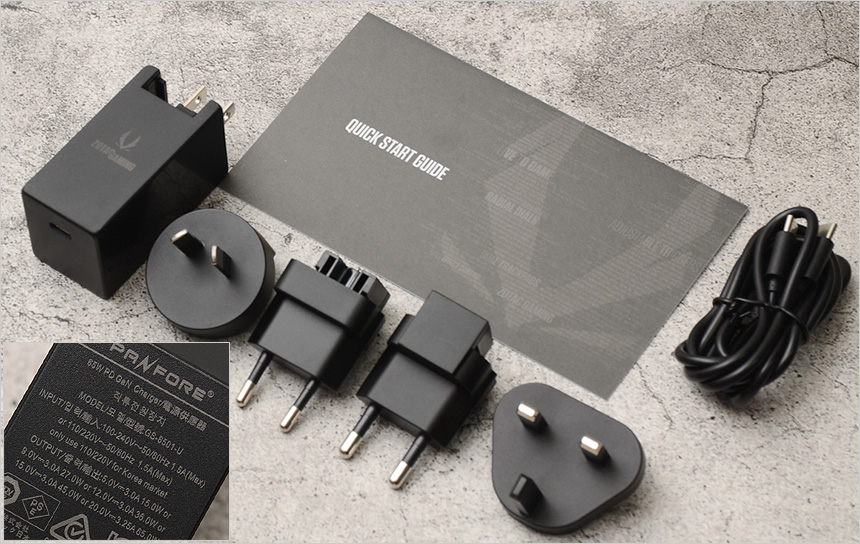 기본 제공되는 액세서리의 모습으로 C타입의 GaN 65W 전원 어댑터와 USB 케이블을 비롯해 다양한 플러그를 제공하며 퀵 매뉴얼도 포함된 것을 확인할 수 있다. (전원 어댑터는 스마트폰 충전용으로 활용할 수 있다.)