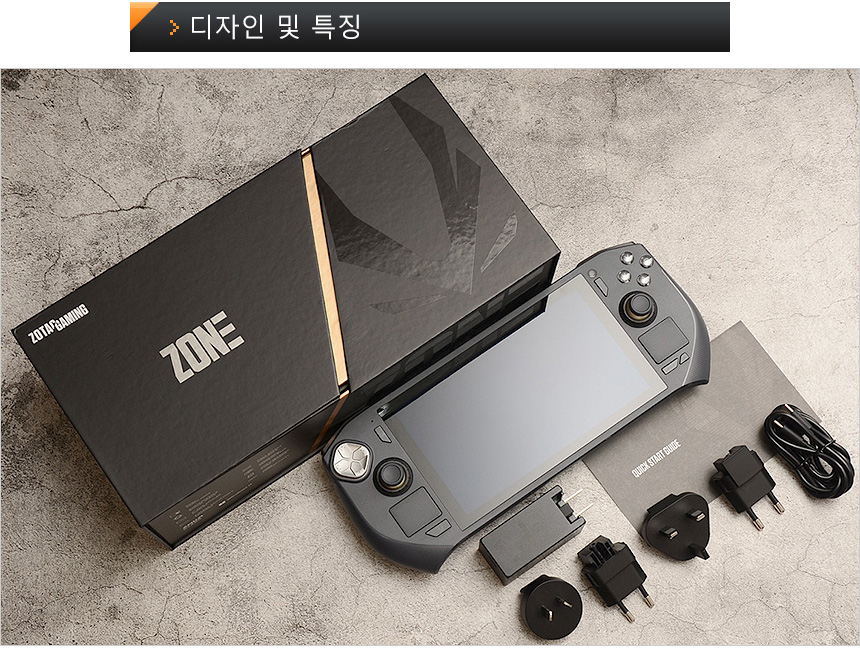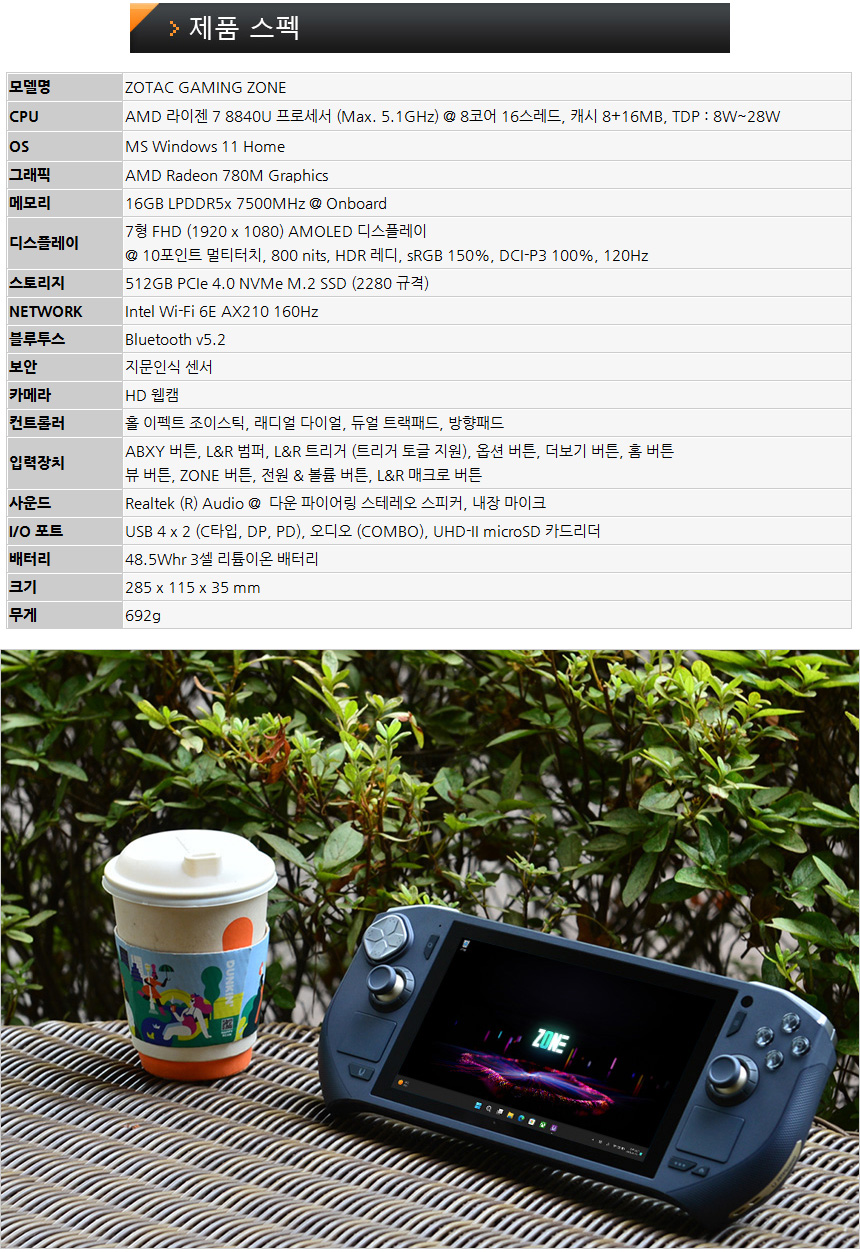 이번에 리뷰를 진행 할 ZOTAC GAMING ZONE 은 고성능 그래픽카드로 유명한 조텍의 게이밍 UMPC로 AMD 라이젠 7 8840U 프로세서를 탑재해 보급형 제품들과 비교되는 높은 성능을 경험할 수 있다. 또한 800nits 의 높은 밝기를 지원하는 AMOLED 디스플레이를 탑재해 자연광이 비추는 밝은 야외에서도 높은 시인성을 경험할 수 있으며 10포인트 멀티터치 지원으로 편의성을 한층 높였다.