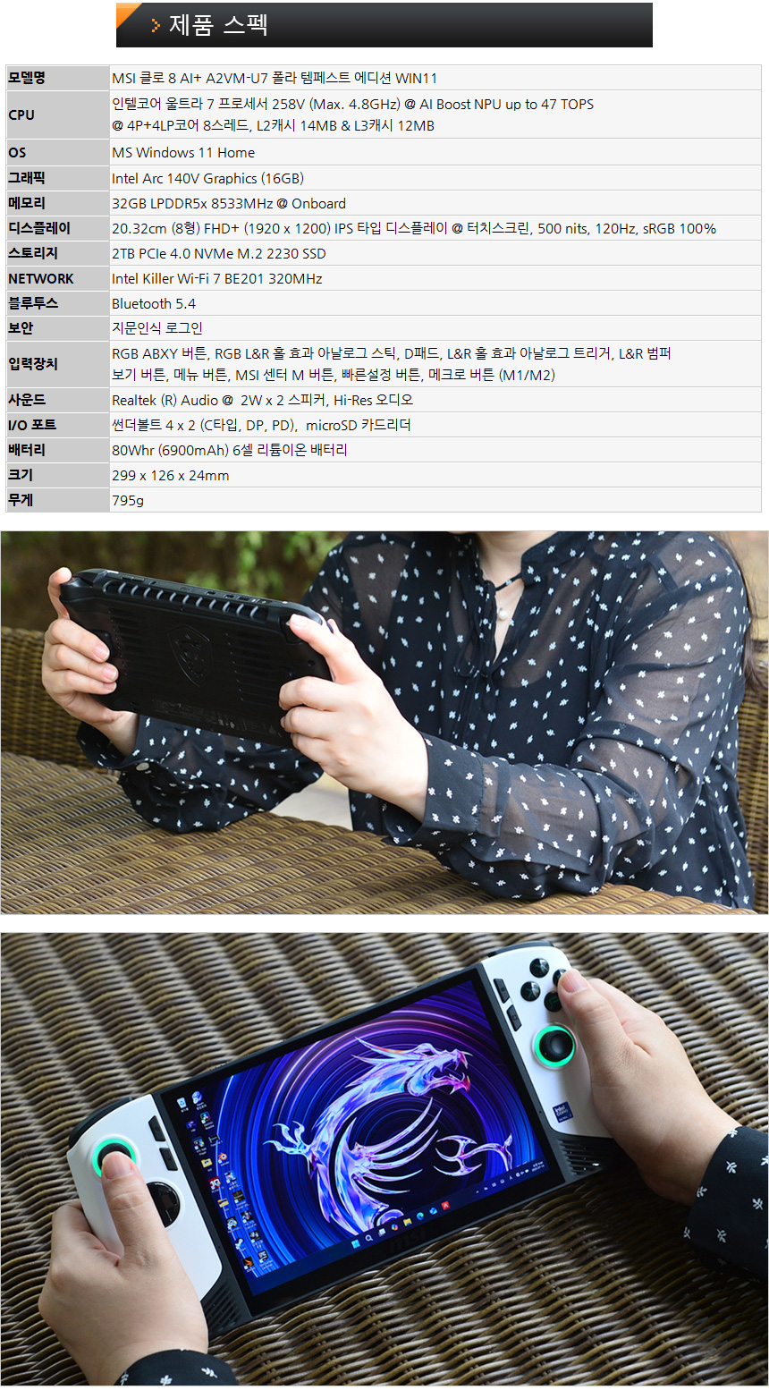 인체공학적 설계로 뛰어난 그립감을 제공할 뿐만 아니라 경쟁모델 대비 가벼운 무게에 스탠드 까지 장착되어 장시간 게임을 즐길때 발생하는 팔의 피로감을 최소화 했다. 뿐만 아니라 2개의 C타입 단자를 제공해 전원을 공급하면서도 주변기기를 편하게 연결할 수 있으며 2280 규격의 SSD가 장착되어 추후 업그레이드가 간편한 장점을 가지고 있다. (경쟁 모델들은 2242 등의 작은 SSD를 사용해 업그레이드시 SSD 선택의 폭이 좁다.)