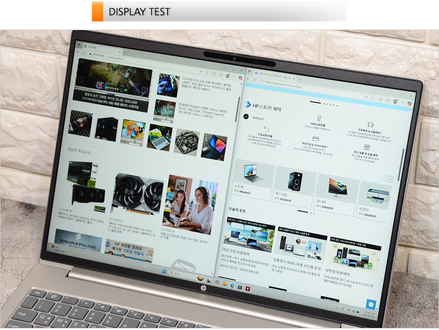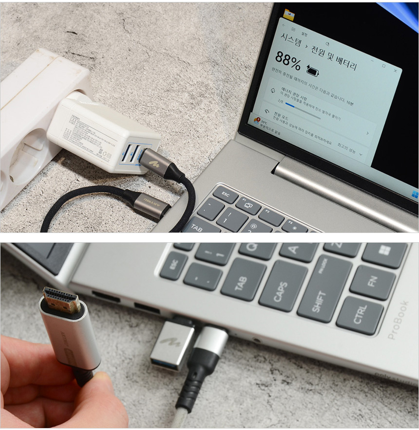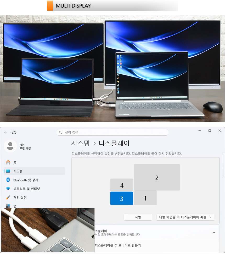 2개의 USB 4 단자가 디스플레이 출력을 지원해 2개의 모니터를 연결해 멀티테스킹 작업을 할 수 있다. 상단의 사진은 4K와 FHD 모니터를 연결해 테스트를 진행하고 있는 모습으로 완벽하게 작동하는 것을 확인할 수 있었다.