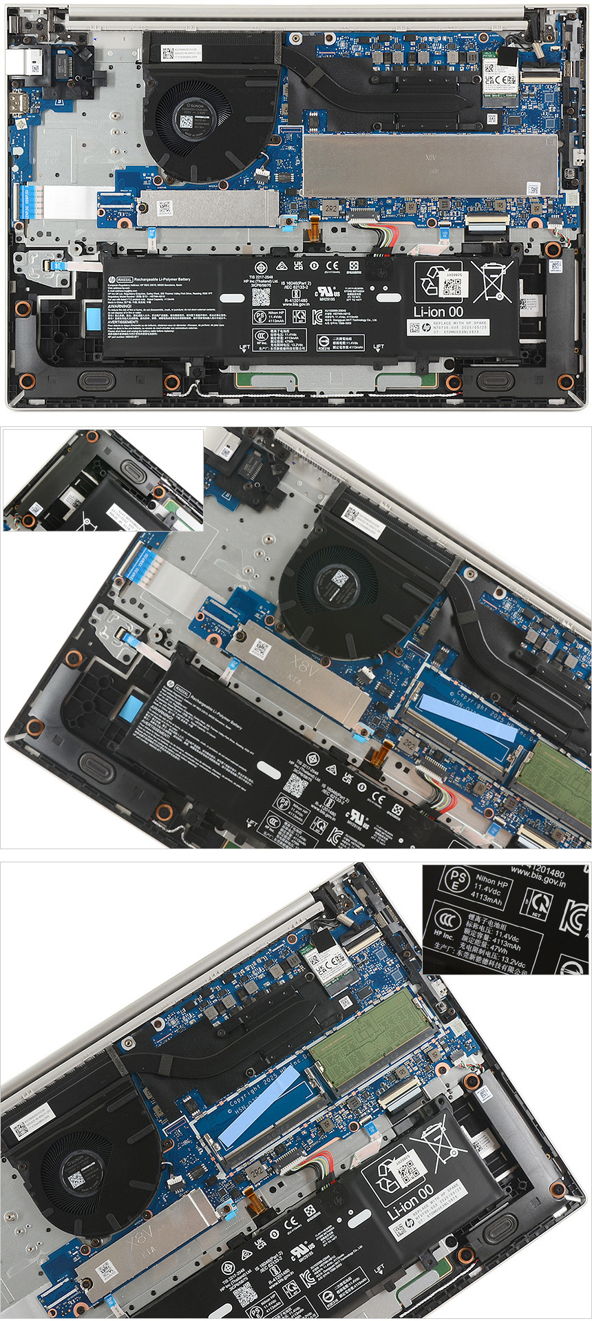 기기 내부의 모습으로 4200mAh 용량의 리튬이온 배터리가 장착된 것을 확인할 수 있으며 대형팬이 설치되어 CPU의 열을 빠르게 식혀준다. (트리플 구리 히트파이프가 설치되어 있고 히트싱크의 핀배열이 조밀해 (60개의 핀 지원) 빠르게 열을 식혀주며 공기 흐름을 안정화 해 냉각 효율을 높여준다.
