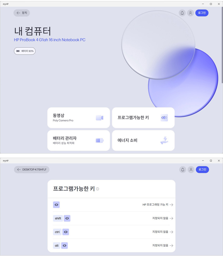 일반 게이밍 UMPC 와 달리 상단에 HD 웹캠이 설치되어 PC용도로 활용할 경우 ZOOM과 같은 화상회의도 가능하며 옵션 버튼과 홈버튼, 더보기 버튼 등이 제공되는 것을 확인할 수 있다.