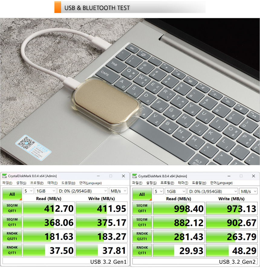 외장 SSD를 이용해 USB 4 단자의 속도 테스트를 진행하고 있는 모습으로 USB 3.2 Gen1 과 확연한 차이를 보여주었다.