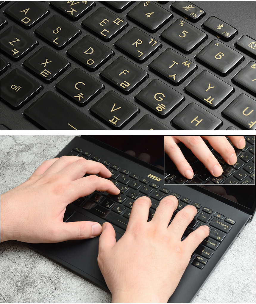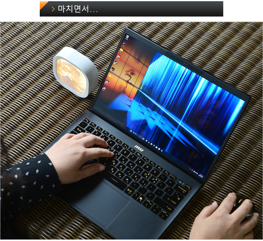 타이핑 테스트를 진행하고 있는 모습으로 컴팩트 노트북이지만 넓은 키간격으로 여유롭게 고속 타이핑을 진행할 수 있으며 드롭 힌지를 적용한 노트북 답게 자연스럽게 손을 올려두고 타이핑 할 수 있었다. 키압고 낮고 통통 튀는 확연한 피드백을 제공해 눈으로 확인하지 않고 오타없는 고속 타이핑이 가능했다. 또한 손을 올려둘 수 있을 정도로 팜래스트가 넓어 장시간 사용시 손목등의 피로감은 크지 않았다.