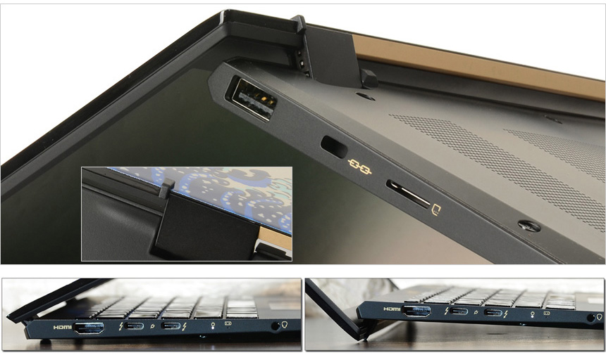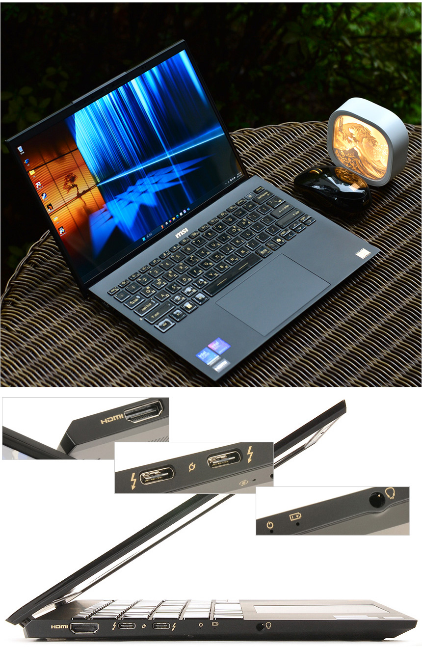 휴대성에 특화된 컴팩트 노트북임에도 다양한 단자를 지원하는 점도 인상적이었다. PD충전과 디스플레이 출력, 고속 데이터 전송이 가능한 2개의 썬더볼트 4 단자 지원으로 활용성을 높였으며 표준 HDMI 와 A타입 USB 단자를 지원해 젠더 등을 사용하지 않고 손쉽게 모니터와 주변기기를 연결할 수 있었다.