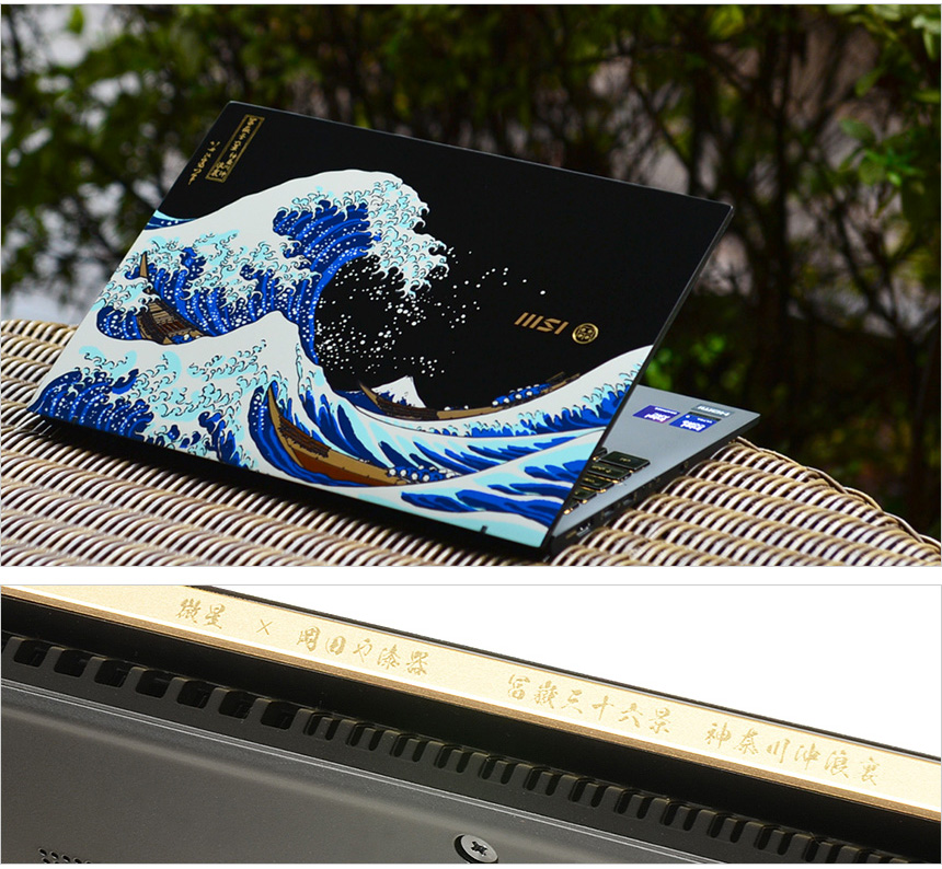 전세계 2,000대만 한정 판매되는 MSI 프레스티지 13 AI+ 우키요에 에디션 A2VMG-U9 2.8K OLED WIN11 은 일본 미술사에서 가장 상징적이고 사랑받는 작품 중 하나인 [가나가와 해변의 높은 파도아래]를 숙련된 장인이 수작업으로 제작했다. 400년 전통 야마나카 옻칠으로 적용하고 여러번의 인쇄 과정을 통해 그림이 프린팅된 일반 노트북과 달리 특유의 질감을 느낄 수 있다.