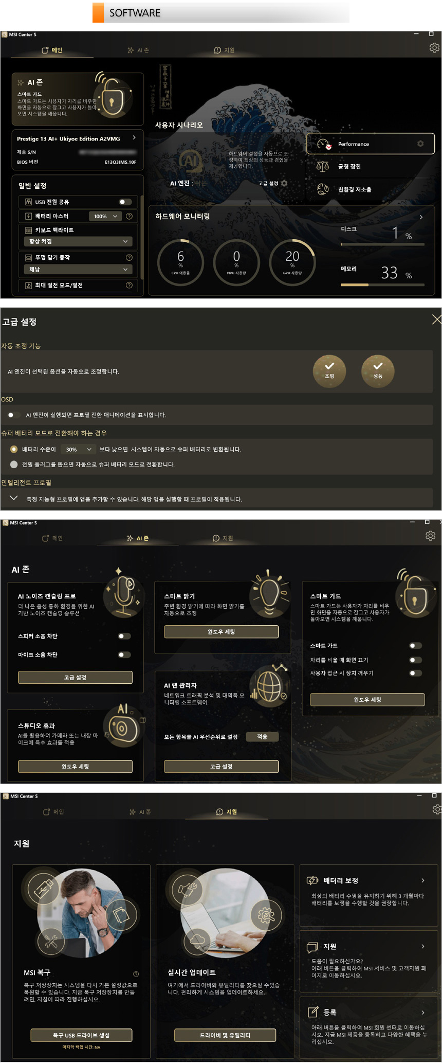 전용 S/W인 MSI 센터 S를 실행한 모습으로 메인화면에서 중요가능 대부분을 설정할 수 있으며 AI 기능을 지원하는 것이 눈에 띈다. 또한 지원에서는 업데이트를 제공해 최상의 컨디션으로 노트북을 사용할 수 있으며 복구 기능도 지원한다.