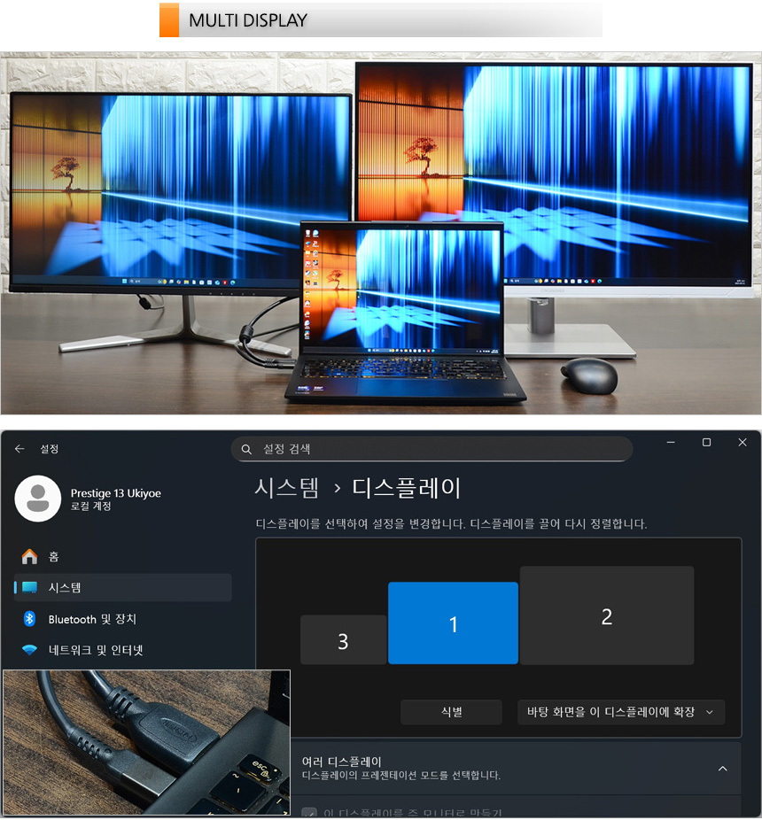 썬더볼트 4 단자가 디스플레이 출력을 지원해 HDMI를 포함한 2개의 모니터를 추가할 수 있다. 상단의 사진은 멀티 디스플레이 테스트를 진행하고 있는 모습으로 원할하게 작동하는 것을 확인할 수 있었다. 다중 모니터 사용이 필수적인 직장인 이나 대학생들이 특히 유용하게 활용할 수 있을 것이다. @ 최대 모니터 개수가 4개인 애로우레이크와 달리 루나레이크는 3개의 최대 모니터를 지원한다. 이점 참조 바란다.