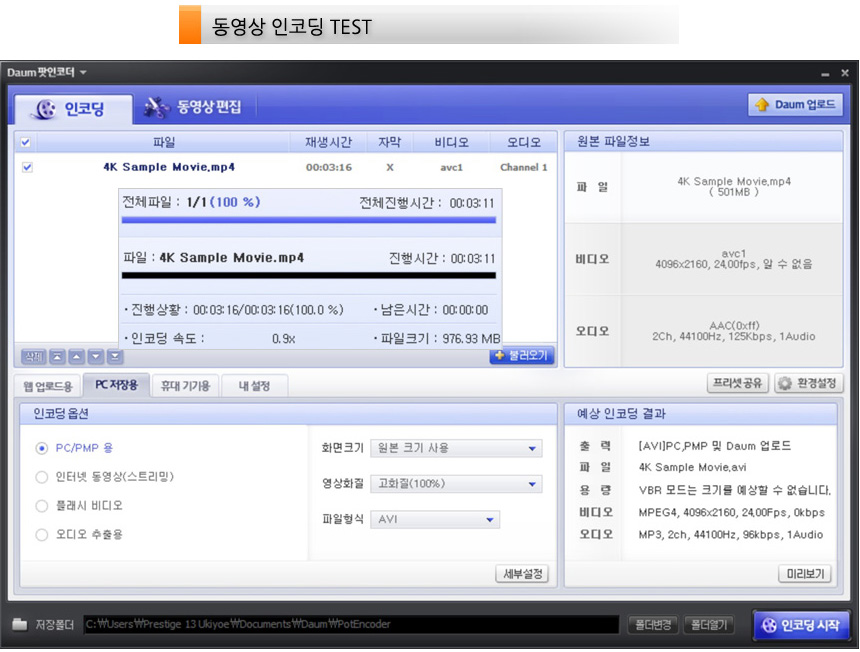 다음 팟인코더를 이용해 4K 동영상의 인코딩을 진행하고 있는 모습으로 3분 11초의 짧은 인코딩 시간을 보여주었다. (게이밍 노트북 수준의 빠른 속도가 인상적이다.)