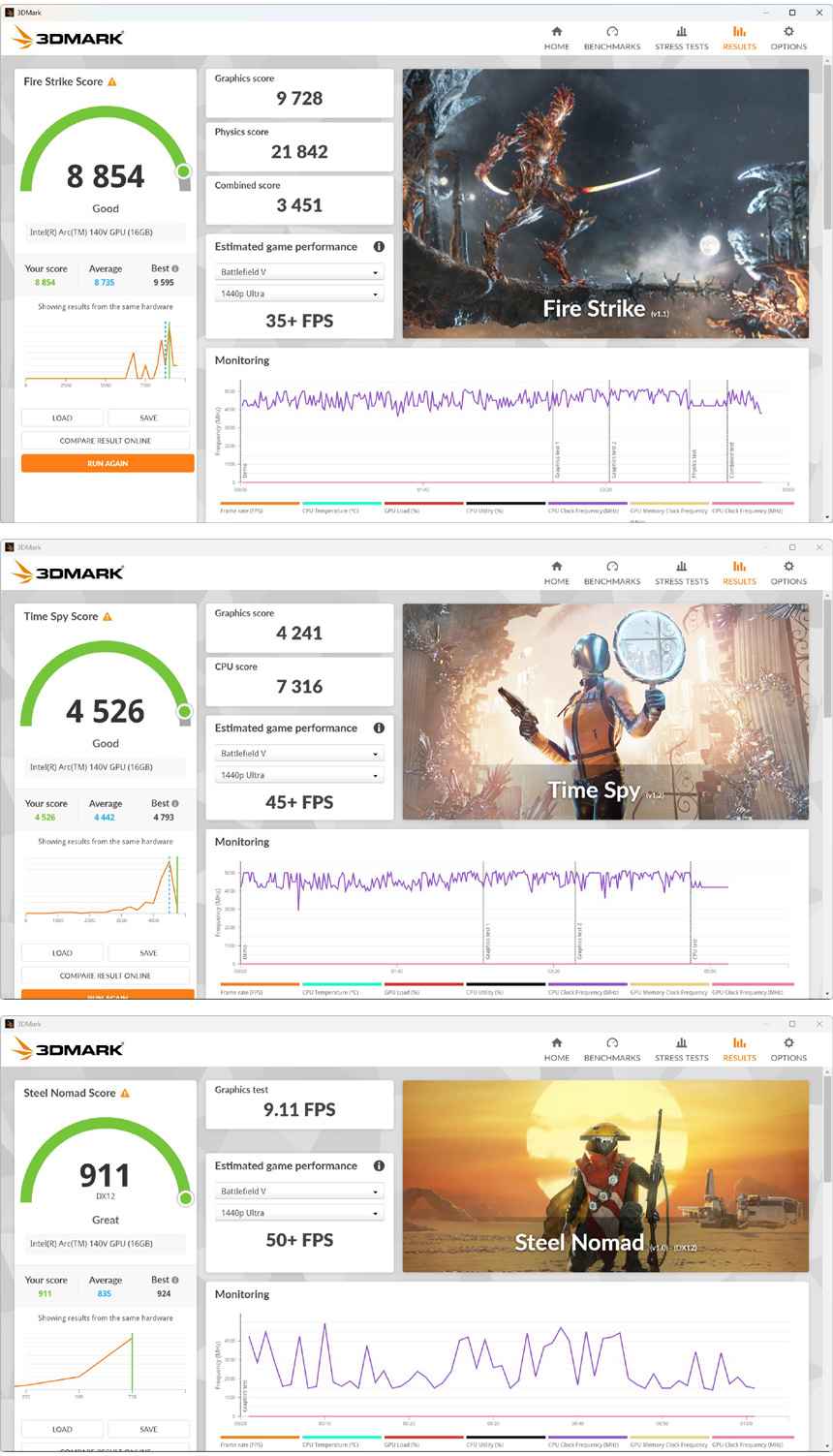 3DMARK를 실행한 모습으로 인텔 아크 내장그래픽 지원 모델답게 높은 스코어를 보여주었다. 최신 게임도 옵션 조정과 스케일링 기술을 사용하면 충분히 즐길 수 있을 것이다.