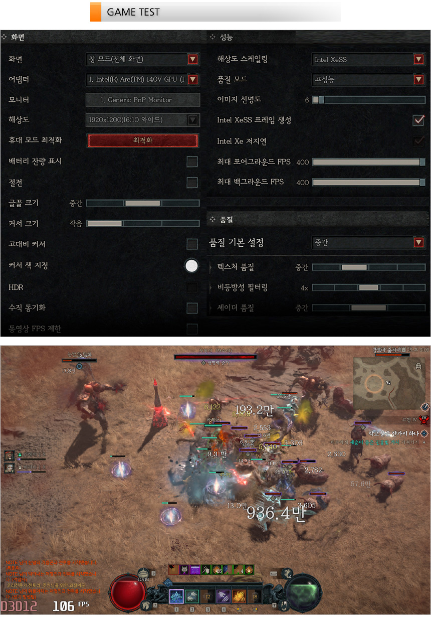 디아블로 4를 실행하고 있는 모습으로 중간 옵션에서 Xess를 고성능으로 설정했을 때 105~120 프레임으로 플레이 되는 것을 확인할 수 있었다. Xess 기술을 활용한다면 (프레임 생성 활성화) 부드럽게 게임을 즐길 수 있을 것이다. (다른 내장그래픽 기반 노트북을 압도하는 수준이다.)