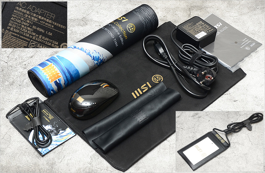 풀KIT 의 모습으로 한정판 에디션 모델답게 다양한 액세서리가 제공되는 것을 확인할 수 있다. 노트북을 비롯해 전원 어댑터와 케이블, 퀵 매뉴얼 보증서가 포함되어 있고 대형 마우스패드와 소프트파우치, 무선 마우스, 크리닝천, 명함이나 신분증 등을 넣고 다닐 수 있는 카드 목걸이를 지원한다.