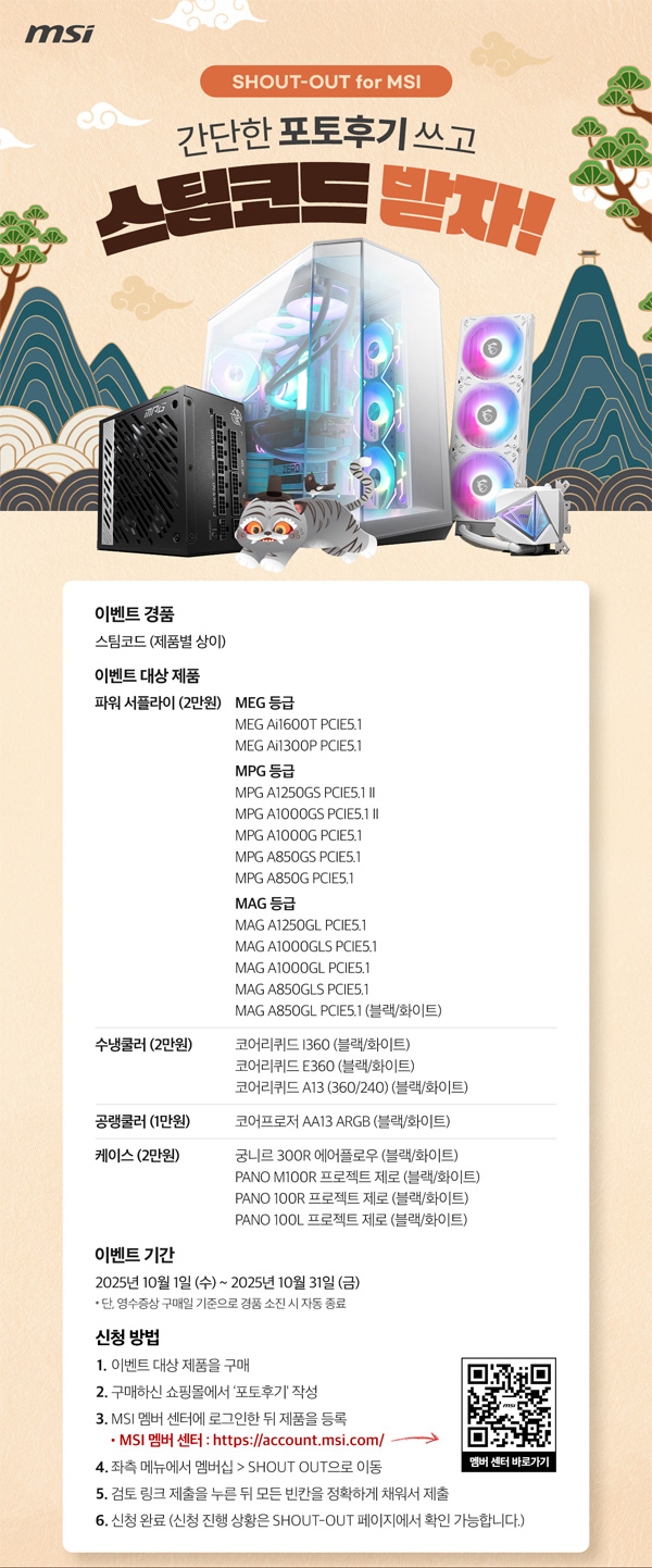 MSI는 2025년 10월 1일(수)부터 10월 31일(금)까지 한 달간 MSI 쿨러, 파워 서플라이, PC 케이스 구매 고객을 대상으로 포토리뷰 작성 시 최대 2만 원 상당의 스팀 코드를 증정하는 ‘Shout Out for MSI’ 이벤트를 진행한다고 밝혔다.