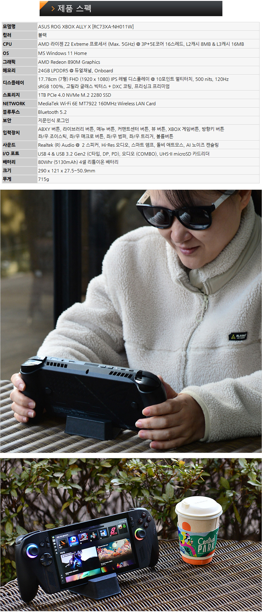 이번에 리뷰를 진행 할 ASUS ROG XBOX ALLY X 는 어디서나 성능이나 배터리 걱정없이 최신 게임을 플레이 하고 싶은 유저들을 위한 최상급 핸드헬드 UMPC로 AMD Ryzen AI Z2 Extreme 프로세서를 탑재하고 24GB DDR5 메모리를 지원해 구형 모델들과 확연히 비교되는 강력한 성능을 경험할 수 있으며 전작 대비 130% 용량이 늘어난 80Wh 대용량 배터리를 탑재해 장시간 게임을 즐길 수 있다.