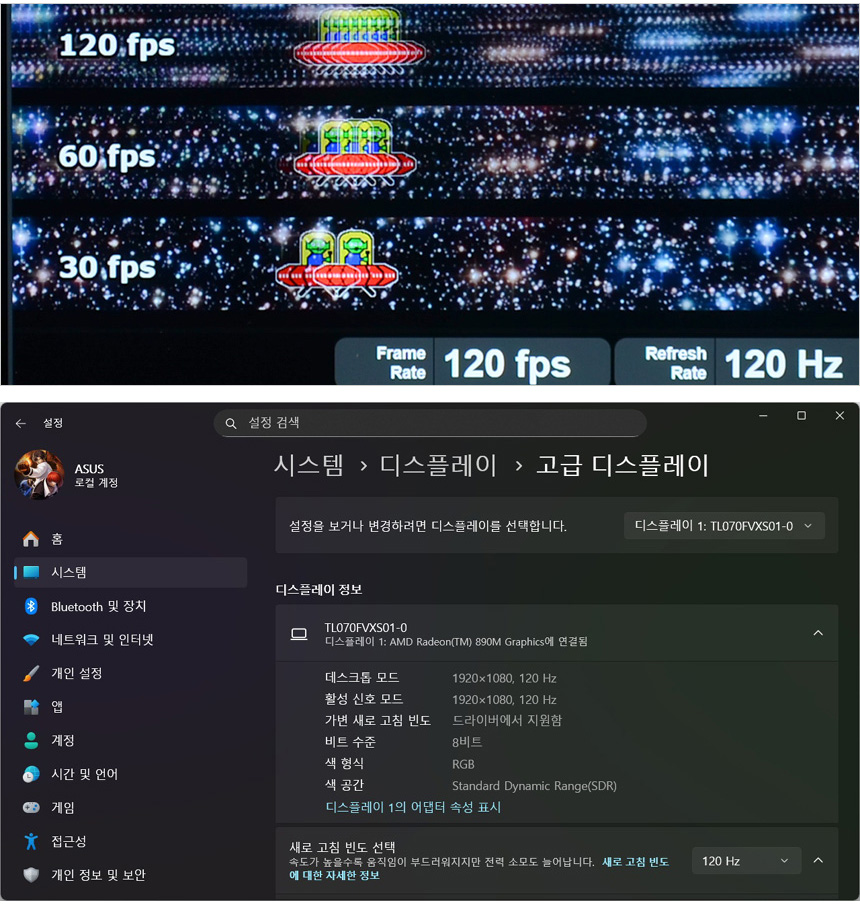 이 제품은 게이밍에 특화된 모델답게 120Hz 주사율을 지원하며 프리싱크 프리미엄 등의 기술이 적용되어 잔상이나 화면 찢어짐과 같은 불편없이 부드러운 게임 영상을 즐길 수 있다. 상단의 사진은 주사율에 따른 캐릭터 움직임을 카메라로 촬영한 모습으로 하위 프레임과 확연한 차이를 보여주고 있다. 최근 출시되는 스마트폰이 90Hz 나 120Hz를 지원하는 것은 특유의 부드러운 화면 전환 때문이다. 이 제품도 60Hz 지원 제품들과는 확연히 다른 부드러움을 경험할 수 있다.