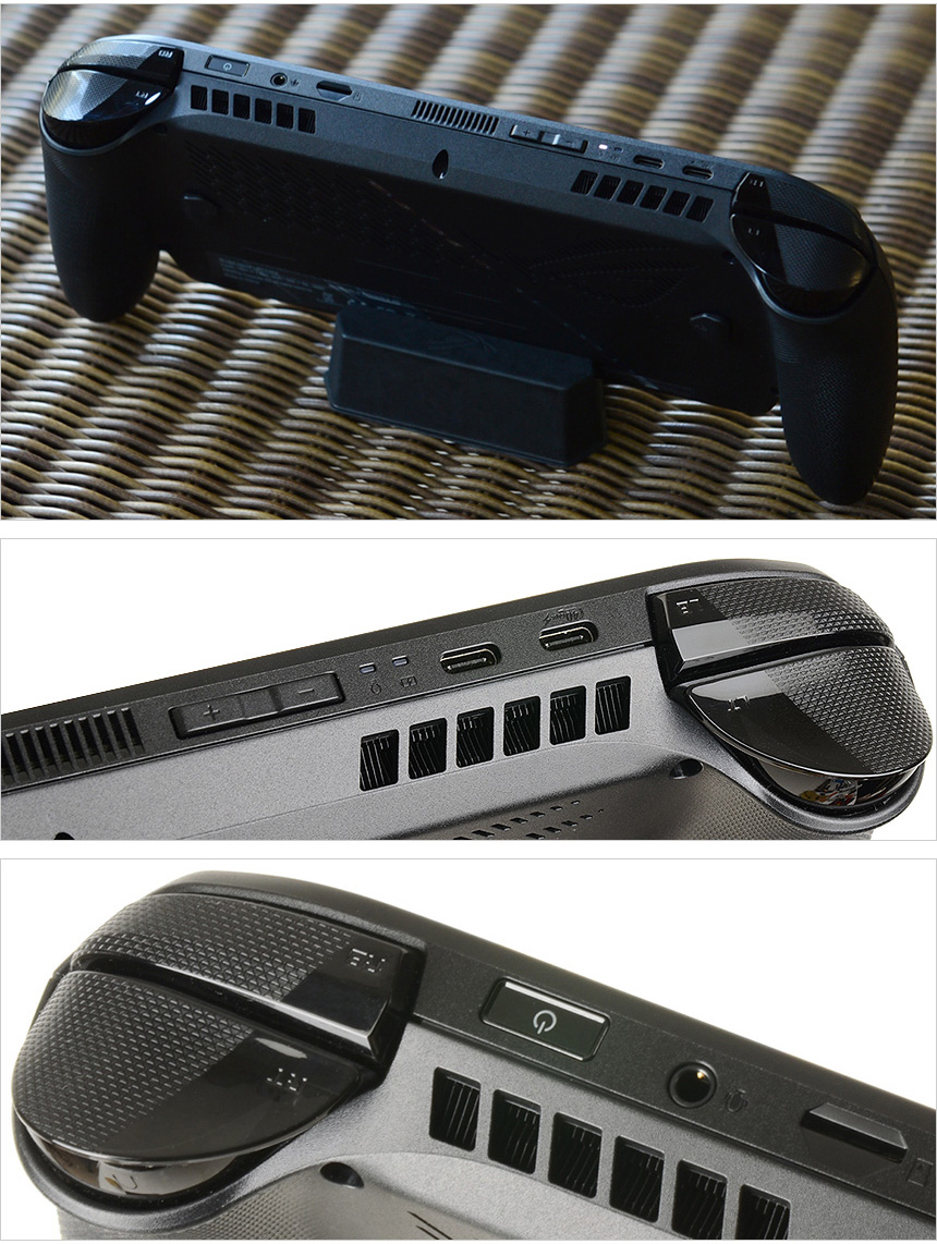 기기 상단부의 모습으로 열이 발산되는 통풍구가 설치되어 있고 양 측면에는 범퍼와 트리커가 설치되어 게임에서 활용할 수 있다. (인체공학적 설계로 편하게 누를 수 있었다.) 전원버튼에는 지문인식 센서를 추가해 보안성을 높였으며 헤드셋이나 이어폰 연결을 위한 오디오 (COMBO) 단자와 저장용량을 늘릴 수 있도록 microSD 카드리더를 제공한다. 또한 2개의 C타입 단자를 지원하며 (USB 4 & USB 3.2 Gen2) LED를 장착해 작동상황을 손쉽게 파악할 수 있다.