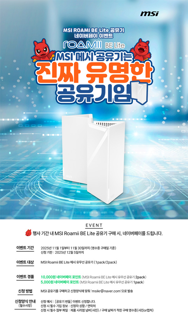 MSI는 MSI의 메시 유무선 공유기 Roamii BE Lite 구매 고객을 대상으로 간단한 구매 인증만으로 네이버페이 포인트를 증정하는 이벤트를 진행한다고 밝혔다.