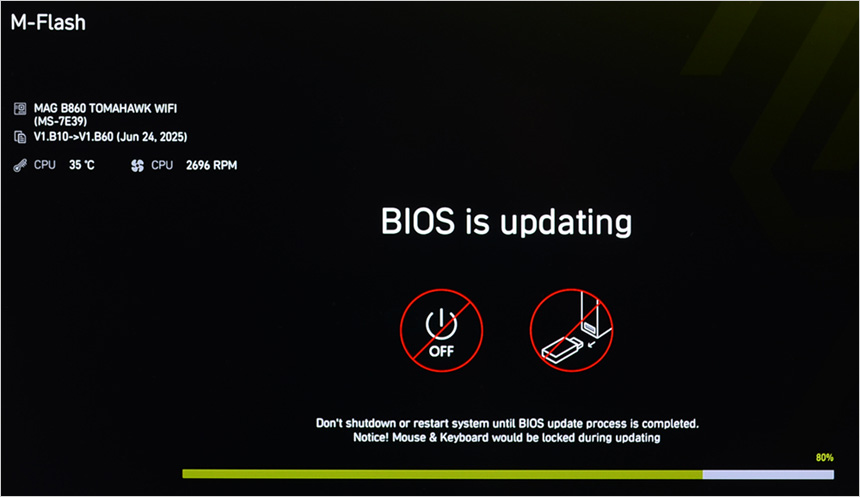 최신 바이오스로 업데이트 하고 있는 모습으로 바이오스의 M-FLASH 메뉴로 들어가면 쉽게 진행할 수 있다. (초보자도 할 수 있을만큼 쉽다.) 이 제품은 고급형 모델답게 바이오스 초기화와 업데이트 버튼이 제공되어 바이오스에 진입하고 않고 간단하게 업데이트를 할 수 있다. @ 최신 바이오스는 MSI 홈페이지에서 다운로드 받을 수 있다.