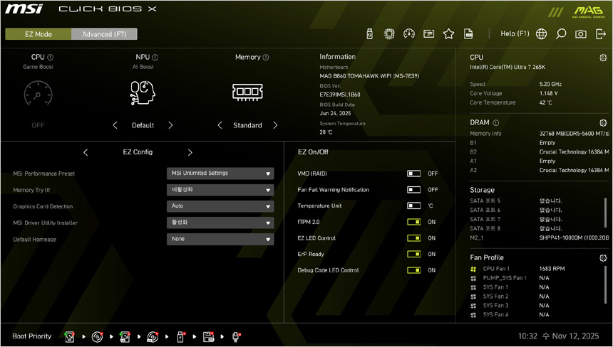 바이오스의 모습으로 EZ 모드에서 중요 기능을 손쉽게 설정하고 시스템을 모니터링 할 수 있도록 인터페이스가 구성된 것을 확인할 수 있다. AI 부스트, 메모리 XMP 등을 손쉽게 활성화 할 수 있으며 Memory Try It 지원으로 메모리 클럭도 오버클럭 메뉴에 들어가지 않고 편하게 조정할 수 있었다.