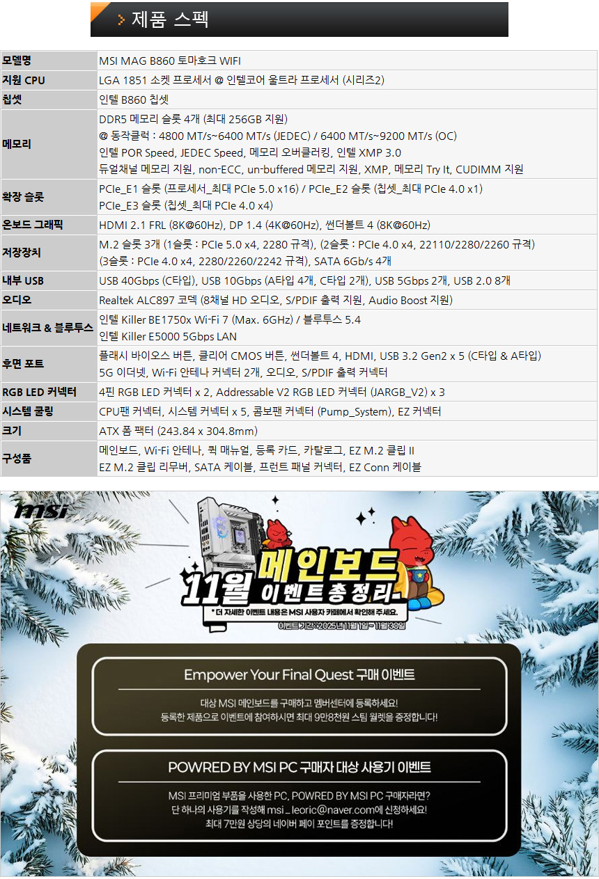 이번에 리뷰를 진행 할 MSI MAG B860 토마호크 WIFI 는 장시간 높은 성능으로 작동하는 게이밍 PC나 작업용 PC를 안정적으로 구동할 수 있는 고급형 메인보드로 보급형 B860 칩셋 메인보드 들과 달리 서버 등급의 PCB 설계와 12+1+1+1 로 강화된 디지털 전원부, 향상된 쿨링 솔루션 적용으로 보급형 CPU는 물론 인텔코어 울트라 265K 나 285K 와 같은 고성능 모델들을 장착해 안심하고 사용할 수 있다.
